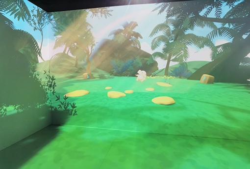 剛一進(jìn)入這個(gè)空間,投影之窗記者便被繽紛色彩充斥的虛擬空間所吸引,該機(jī)7000流明的高亮度令投影畫(huà)面明亮清晰,EPSON成熟3LCD技術(shù)所帶來(lái)的高色彩亮度優(yōu)勢(shì)在這里被體現(xiàn)得淋漓盡致。5m*4.25m*3.1m的空間盡數(shù)被光影所覆蓋,“打破次元壁”的沉浸氛圍油然而生。