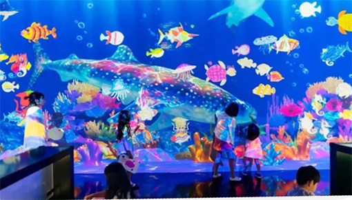這個水族館能夠讓大家所創造的魚兒盡情地遨游。在紙上隨意描繪魚的圖案,隨之被描繪的圖案,會像被注入了生命一樣,游入眼前巨大的水族館中。當你觸碰到游泳的魚時,被觸碰的魚兒會馬上逃跑。當觸碰到餌食的袋子時,袋子里的餌食會讓魚兒們飽餐一頓。