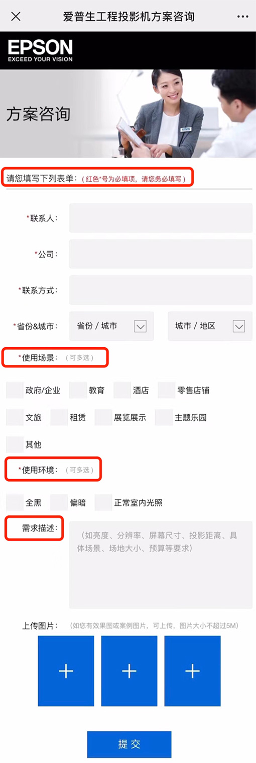 現在來愛普生工程投影機微信公眾號,點擊【用戶服務】--【方案咨詢】