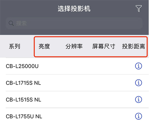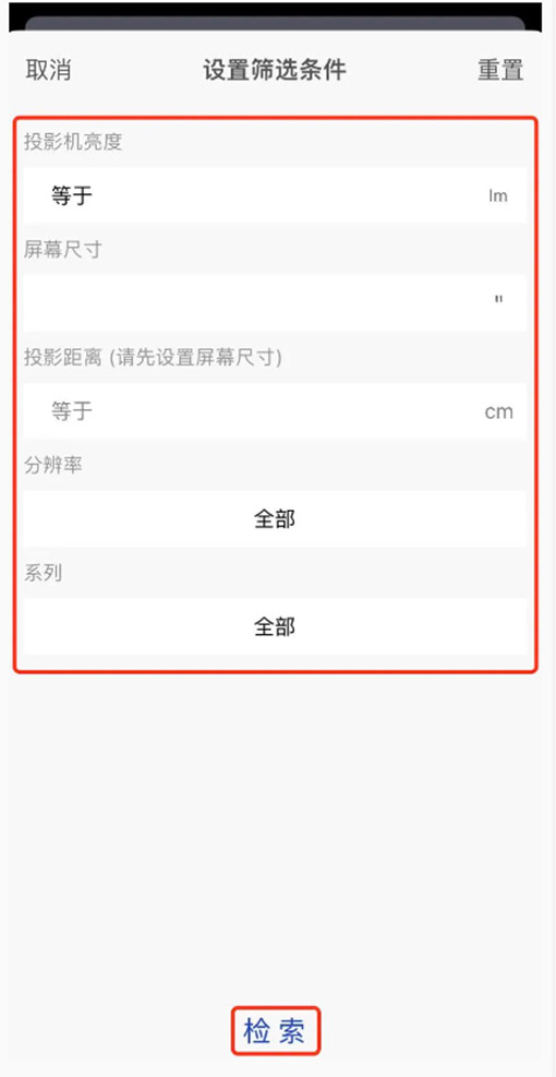 首先我們打開愛普生投影機距離APP主頁,點擊菜單欄,輸入自己的篩選條件,