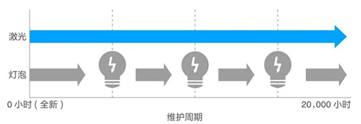 上述時間為非承諾保修時間。激光光源亮度將隨使用時間的增加而逐漸降低。激光光源實際使用壽命受使用模式、環境條件、用戶使用習慣等因素影響會有很大差別。投影機在低亮度模式下使用,激光光源使用壽命會得到有效延長。