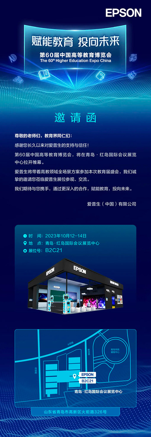 [投影之窗報道] 2023年10月12日-14日,第60屆中國高等教育博覽會將在青島·紅島國際會議展覽中心拉開帷幕。愛普生將以“賦能教育 投向未來”為主題,并攜高教領域全場景方案誠意亮相。