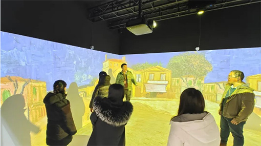 活動(dòng)現(xiàn)場(chǎng),愛(ài)普生使用4臺(tái)3LCD激光投影機(jī)搭建了360度的沉浸式“跨學(xué)科融合學(xué)習(xí)‘X空間’”,空間內(nèi)結(jié)合AI,讓學(xué)生們可以跨越時(shí)空與梵高對(duì)話,展示了融合教學(xué)場(chǎng)景實(shí)例。