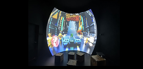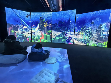 下一個光影空間內,4臺愛普生激光工程投影機疊加融合投影在直徑5米的弧形幕上。在通過自己的努力修復飛船后,我們終于踏上了新的旅程,長達8分鐘的影片內容元素完全來自“迷你世界”游戲中素材,伽馬星球以技術力與創造力結合影像至臻色彩的表現力,為參與飛船維修的“小英雄”們上演了一場驚心動魄的“星際穿越之旅”。