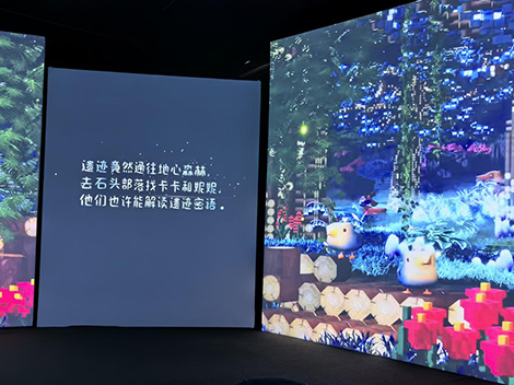 在任何光影展中,“故事性”的內容都是吸引觀眾的重中之重,而對于一款游戲而言,內容更是其安身立命之本。伽馬星球為這一光影空間創造了長達30余分鐘不間斷、不重復且有連貫故事性的內容,其中運用到“迷你世界”游戲內同款建模,提升玩家的“歸屬感”。