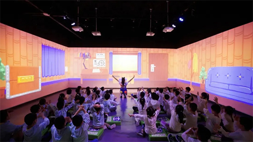 潘德是主角兒童劇場使用了6臺愛普生超短焦投影機,通過融合技術和270°的環繞設計,在有限的空間內,為孩子們打造了一個更好的沉浸效果,賦予了小朋友們交互體驗感,使其真正的融入到整個故事情節里,身臨其境的感受兒童舞臺劇的魅力。