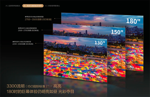 在亮度方面,擁有高達(dá)3,300流明(ISO標(biāo)準(zhǔn))*1*2的真實(shí)亮度。即便是在180吋巨幕上,CH-QB1000B都能保持畫(huà)面清晰銳利,為用戶帶來(lái)明亮通透的大屏觀影體驗(yàn)。
