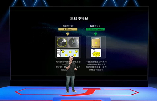 “黑科技”可以說是本次發(fā)布的J系列投影機(jī)的一大賣點(diǎn)。相比起傳統(tǒng)的投影機(jī),麥克賽爾J系列投影機(jī)省去了熒光輪、機(jī)械馬達(dá)等轉(zhuǎn)動(dòng)部件,轉(zhuǎn)而用“陶瓷熒光體”代替。首先,從體積上相比,陶瓷熒光體僅為熒光輪的1/3,這也使J系列小巧的原因之一。其次,與傳統(tǒng)的熒光輪相比,陶瓷熒光體內(nèi)的磷顆粒貼合更緊密且結(jié)構(gòu)穩(wěn)定,這也就意味著采用陶瓷熒光體的投影機(jī)光轉(zhuǎn)換效率并不受激光強(qiáng)度與照射時(shí)間的影響,這不僅提高了畫面質(zhì)量,更提升了投影機(jī)的使用壽命,一舉兩得。