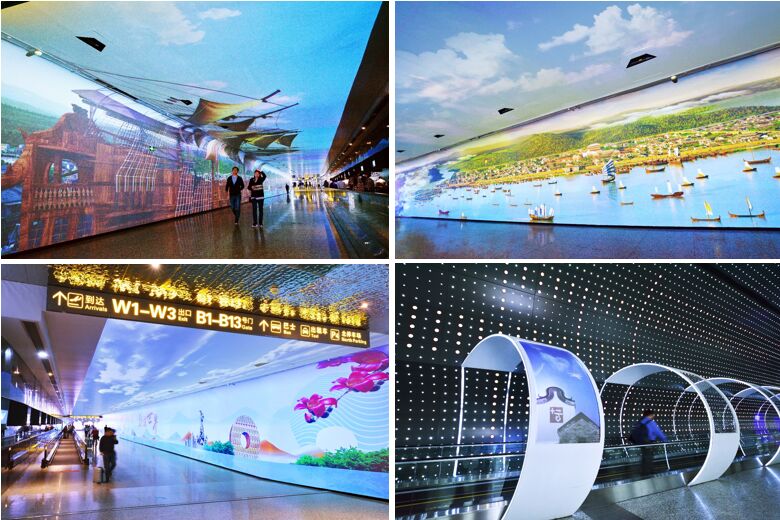 [投影之窗消息] 人在旅途,機場中轉站成為旅客掃去一身疲憊的落腳點。為了提升旅客飛行前后體驗,廣州白云國際機場著力于借助高科技手段激活機場空間,打造了一條集公共服務、藝術展示、廣告發(fā)布于一體的“時空隧道”,這在全國機場尚屬首創(chuàng)。在全長約200余米,空間面積超過2500平方米的時空長廊中,總共采用54臺NEC激光投影機,帶來一場奇譎夢幻的穿越之旅。