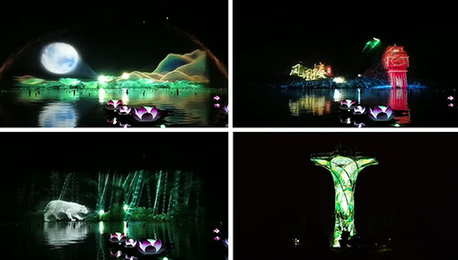 4萬流明雙色激光工程投影機打造出50*15米高超大水上銀幕,隨著音樂與燈光的變化起起伏伏。PH3501QL+采用紅藍雙色激光光源技術,將圖騰、蓮花、閃電等場景元素的絢爛動態影像投射到水幕上,在光怪陸離的全息光影中把蓮花湖幻化成了“人間仙境”。