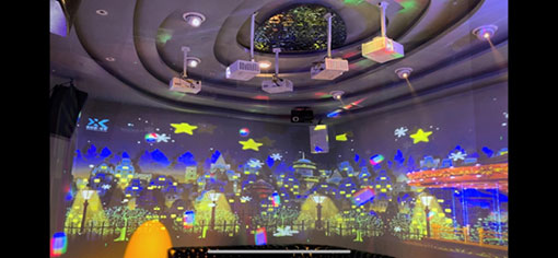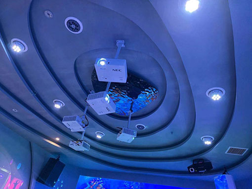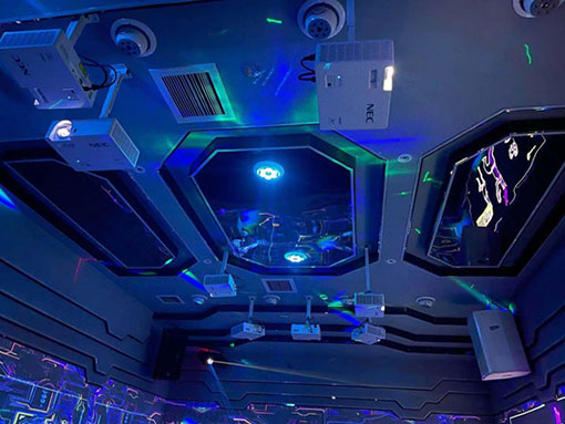 經(jīng)常唱K的朋友都了解,老式KTV包房往往給人一種千篇一律的沉悶狀態(tài),東方國(guó)際大酒店的沉浸式KTV則打破了傳統(tǒng)的KTV模式。得益于NEC騎士系列投影機(jī)的短焦優(yōu)勢(shì),每間包廂采用8臺(tái)CS3300WL(4000流明、WXGA分辨率、激光光源),通過拼接融合的方式,在三面墻體上打出大畫面,讓整個(gè)房間充滿五彩斑斕的動(dòng)感效果,帶給人不一樣的震撼視野和感官體驗(yàn)。即使拐角處,依然使用投影機(jī)投射,使整體畫面的融合更加飽滿,營(yíng)造出渾然一體的視頻效果。