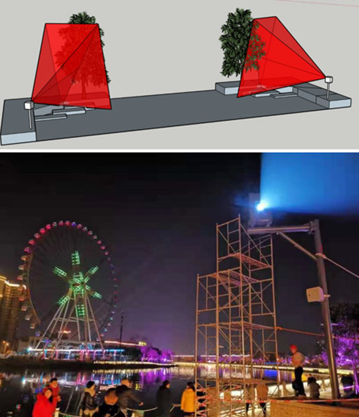 毗河灣游人如織,光影“魔樹”的呈現既要保證效果,又不能妨礙到游客的參觀。因此,方案設計前期就考慮到了空中作業方案,在半空中搭建了投影平臺。兩臺PX2000UL+分別置于箱體中,而箱體則固定于10余米高的支撐柱上。這樣的設計方式讓英雄的可投影畫幅得到最大程度釋放,投影機自帶50%水平位移也解決了固定高度安裝方式所帶來的調試難題。并且光路的高度足以避開游客的遮擋,即便游客走到大樹跟前,近距離欣賞、觸碰這難得一見的光影奇景,也不會阻礙到光路,讓大樹依舊光彩奪目、“無影”無蹤。