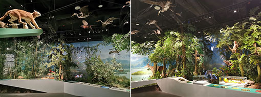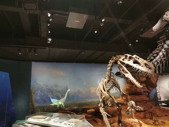 PX803UL-BK+(8000流明、WUXGA分辨率)采用吊裝側(cè)投的方式投影的株洲地質(zhì)圖,以多彩的地形地貌開啟自然地理展的序幕。緊接著,由9個(gè)恐龍骨架組成的恐龍骨架群映入眼簾,其中4米多高、7米多長(zhǎng)的霸王龍骨架成為最亮眼的主角。而與恐龍骨架群形成完美呼應(yīng)的正是由2臺(tái)NEC