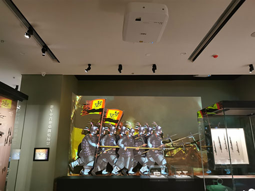 PX803UL-BK+采用異形雕塑投影的方式,在火焰雕塑上勾勒出株洲的前世今生。NEC獨(dú)有的GCT幾何校正功能提供了強(qiáng)大的技術(shù)支持,通過對(duì)投射圖像快速、精細(xì)地調(diào)整,確保畫面內(nèi)容和火焰雕塑完美契合,給觀眾帶來震撼的視覺沖擊。進(jìn)入南楚要塞展區(qū),由2臺(tái)NEC投影機(jī)復(fù)原的楚國(guó)軍卒合葬墓場(chǎng)景分外引人注目,七把青銅劍的背后隱藏著發(fā)生在2000多年前的戍邊之戰(zhàn)。其中1臺(tái)NEC激光投影機(jī)PA803UL+(8000流明、WUXGA分辨率)采用實(shí)物光雕投影的方式,通過清晰明亮的畫面再現(xiàn)2000多年前楚國(guó)軍卒手持吳戈征戰(zhàn)、護(hù)衛(wèi)邊疆的戰(zhàn)爭(zhēng)情景。而另1臺(tái)NEC