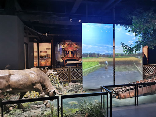 秀美株洲,人杰地靈。四層的民俗文物展,以生動(dòng)且富有吸引力的場(chǎng)景復(fù)原和實(shí)物陳列,再現(xiàn)舊時(shí)的生活生產(chǎn)場(chǎng)景,留住時(shí)代底色,傳承民俗文化。在農(nóng)耕民俗展區(qū),由2臺(tái)PX803UL-BK+通過雙機(jī)背投的方式在全息透明幕上打造的畫卷式投影,畫面清新唯美,景色秀麗迷人。其中,漁民泛舟江上、農(nóng)民下田勞作的情景與展廳布置渾然一體,令參觀的觀眾心曠神怡,仿佛置身于江南的大好風(fēng)光中。