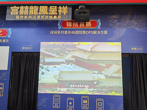 在“錦繡良辰”的展示區(qū),NEC采用了10000流明、4K分辨率的激光投影機PX1005QL-B+播放皇帝大婚的“先導片”,同時考慮到該部分展演在整體文創(chuàng)IP中的次要性以及場地的限制,投影機特別搭配了0.37反射式超短焦鏡頭,在不占用大空間的前提下向游客展現紛呈的故事。