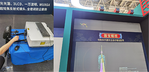 “國寶耀視”展示區(qū)恰如其名,采用了1臺由NEC哈勃系列PA1004UL-W+通過背投形式在半透明的紗幕上展現出裸眼3D的精美皇宮至寶。