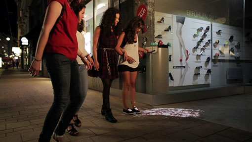 Nude門店前,地面上的一簇光影瞬間吸引到了顧客的注意力,隨后光影由地面移動(dòng)至櫥窗前,在櫥窗的背墻上展現(xiàn)出產(chǎn)品特寫。這樣一番光影變幻之后,哪個(gè)顧客心里不是小粉泡泡蹭蹭冒,看啥都是我想要。