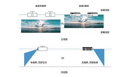 李白短焦系列擁有先進的零偏移光軸設計,對實際空間的利用達到最大化,可杜絕機器傾斜安裝和二次梯形校正導致的光損,真正做到光效無損輸出,不僅為用戶提供優質的影像效果,還在安裝方面實現了優化。