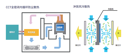 此外,新空靈系列不僅對光源、光引擎部件做到了精準散熱,還采用沖突風冷技術對液晶板散熱進行了提升,避免液晶面板受熱過高造成色彩失真的情況,并延長液晶板的使用壽命。對于人流量高、密閉空間的應用環境來說,兩項技術的加持讓用戶使用更安心。