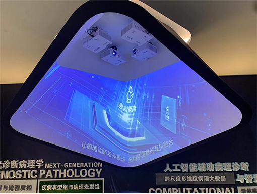 對于病理的研究,不光是應用在當下臨床醫學,未來遠程診斷發揮空間更廣。在下一代診斷病理學區域,可以看到傘形環繞腔體內展示著實驗室關于人工智能輔助病理診斷的最新研究成果,將病理、影像、組學與臨床信息交叉融合,組成多維度病理大數據。腔體內采用4臺NEC騎士系列投影機CS3300WL,4000流明亮度,0.52投射比的短焦鏡頭,打破空間狹小限制,短距離即可投出大畫面。此外CS3300WL支持360度安裝,搭配豐富幾何校正功能,安裝更加便捷。小巧機身完美“隱藏”在腔體內,打造沉浸體驗空間。