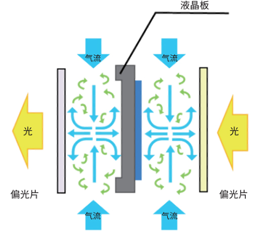 普通LCD投影機(jī)的液晶板冷卻方式為一側(cè)進(jìn)風(fēng),另一側(cè)出風(fēng),利用風(fēng)道將投影機(jī)工作時(shí)液晶板產(chǎn)生的大量熱量帶走。這種方法雖然簡(jiǎn)單,在效果上卻差強(qiáng)人意,液晶板靠臨進(jìn)風(fēng)口的一端和靠近出風(fēng)口的一端在溫度上相差懸殊,極不均勻的散熱大大影響液晶板的壽命。