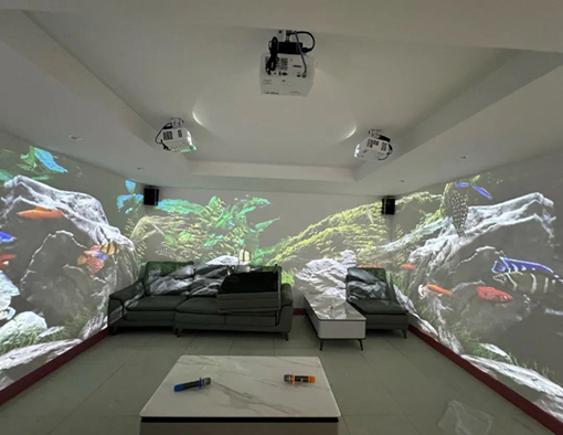 隨著新生代消費力量日漸崛起,娛樂體驗升級成為各大休閑場所提升人氣、開源增收的重要命題。灃林居會所緊跟時代潮流,與NEC顯示產品傾情合作,采用多臺NEC飛魚短焦系列激光投影機,通過投影融合技術,將KTV包廂打造成渾然一體的沉浸式娛樂空間。