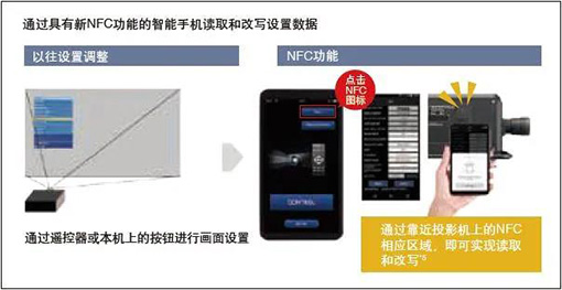 現(xiàn)已針對(duì)Android™和iOS進(jìn)行了更新,搭載NFC功能實(shí)現(xiàn)即時(shí)配對(duì),可以讀取并改寫(xiě)投影機(jī)設(shè)置菜單,并可通過(guò)智能手機(jī)的相機(jī)進(jìn)行自動(dòng)聚焦。