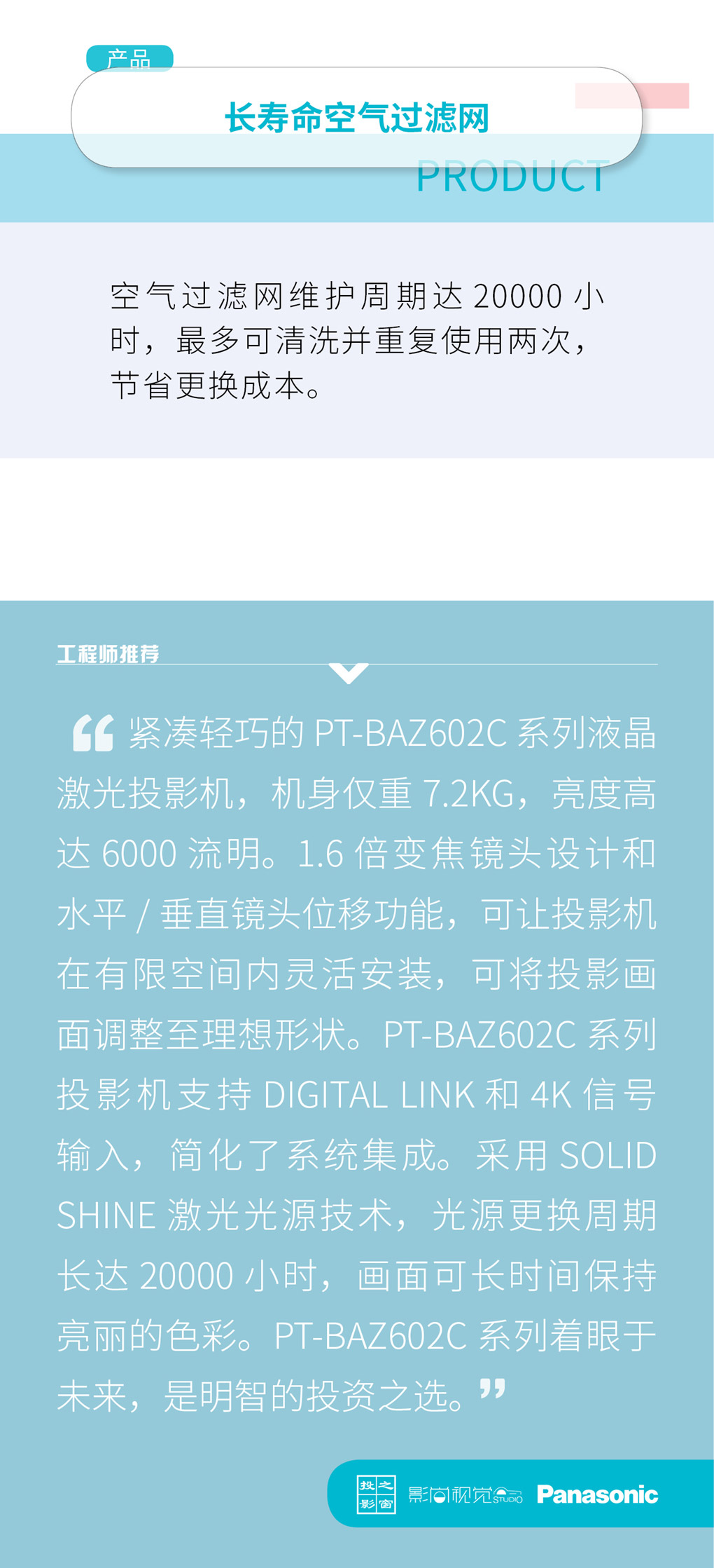 活躍在媒體娛樂行業,廣播電視行業,公共行業,教育行業,制造行業等領域,在向行業客戶不斷輸出整體解決方案的同時,也促進了其經營的持續創新與進步。如欲了解更多信息,請訪問集團網站:http://www.panasonic.com/global,中國區官方網站:http://panasonic.cn,官方微博網址:http://e.weibo.com/aboutpanasonic,官方微信:Panasonic松下中國 |