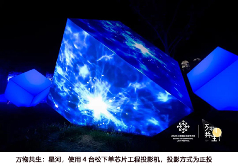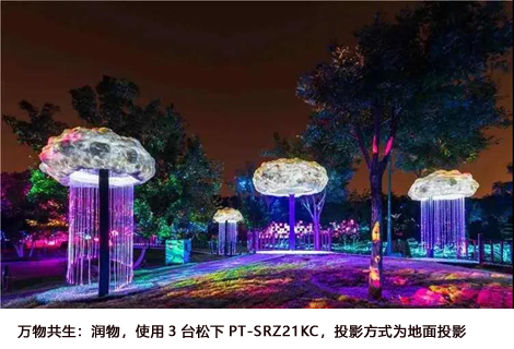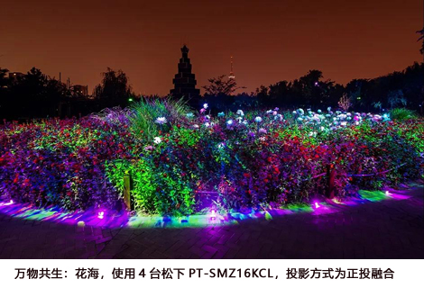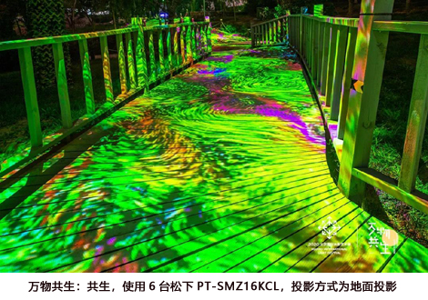 “萬物共生”共有15個作品區,其中有6個作品區使用到了投影設備,由安恒集團提供投影系統解決方案與設備支持,項目共使用24臺松下工程投影機,同時還應用了24臺安恒集團自主研發的戶外防護箱體,對投影機采取保護措施。