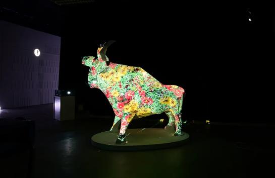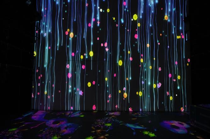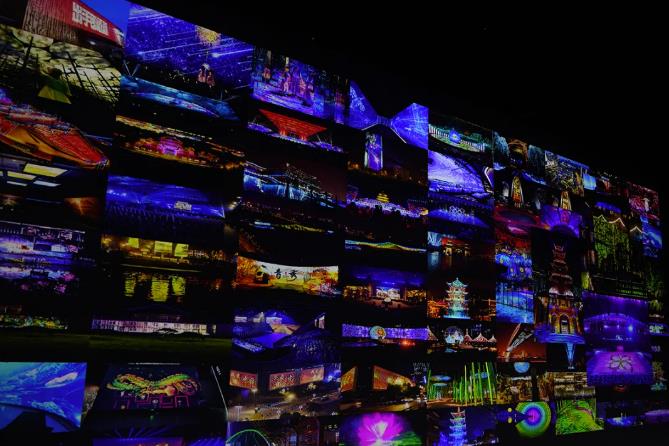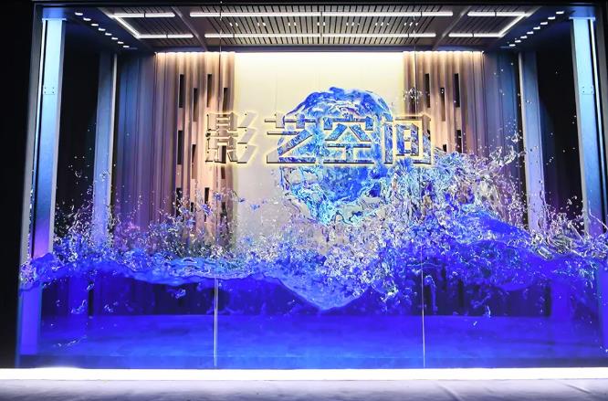 展項描述:從正門進入,率先映入眼簾的是一面巨幅的Logo墻,直觀而又震撼地展示了“影藝空間”四個大字,絢麗的光影在墻面上舒展、綻放,形成極富視覺沖擊力的形象展示與名片效應。