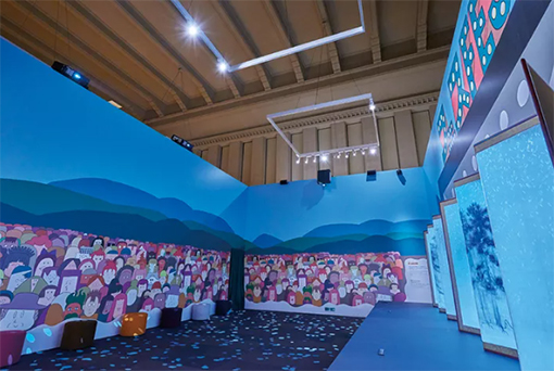 高約2米的巨大硯箱,周圍繪制了橋和池塘。池塘里投影了數條魚,當人靠近時,魚會向人靠近;當人蹲下時,魚會轉圈。使用兩臺PT-RZ870J(中國型號PT-FRZ88C)投影機不僅用于投射出下雨和螢火蟲飛舞的樣子,也將魚們輕松的情緒和現實環境中與人的互動表現完美呈現出來。 |