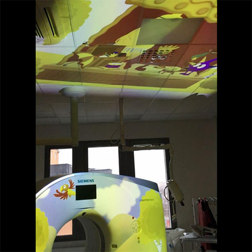 托馬斯的團隊接受了挑戰,打造了一個交互式投影和聲音解決方案,最終方案取得了令人驚訝的成果。CT檢查室配備了兩臺松下激光投影機,可以將影像投射到天花板和CT掃描儀上以營造一個沉浸式的環境,加上四個揚聲器以及一個觸摸屏幕,讓患者徜徉于十種不同的舒緩效果之中。身臨其境的視覺美景,耳邊傳來熱帶雨林里潺潺的流水聲和清脆的鳥鳴聲,接著是水下的絕美世界,家喻戶曉的卡通角色也一路與你相伴。