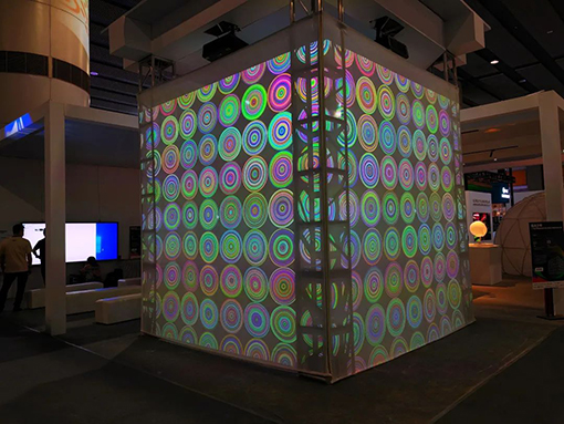 一個3米5見方的空間,朦朧的紗幕四面環繞,四臺松下PT-FRZ99CL工程投影機被安裝在紗幕內部,背投出一個個繁復絢麗的同心圓。
