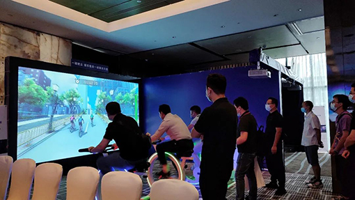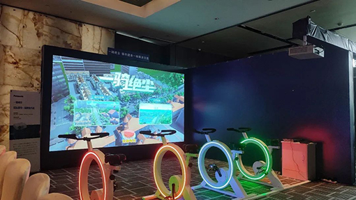 其中“一騎絕塵”是一款AR虛擬騎行單車互動產品,方案搭載一臺松下PT-BMZ51C系列高清投影機以及服務器和騎行單車,即可滿足戶外騎行的體驗,出色的產品也引起了現場眾人的紛紛體驗和圍觀,現場氣氛高漲。