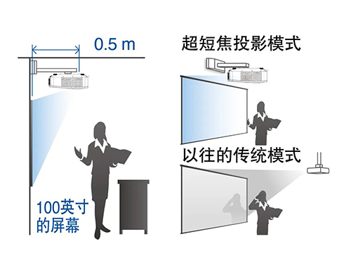 超短焦鏡頭設計,光學部件能夠從驚人的短距離約0.5m進行100英寸的大屏幕投影。PT-GMZ451C可以利用固定支架安裝于墻面,用于墻壁投影。也可以將投影機緊鄰屏幕放置,即使使用者站在圖像前面也不會遮擋投影機光路,使圖像出現陰影。