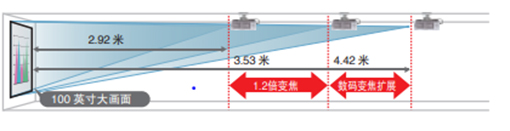 松下PT-LMZ460C系列投影機(jī)通過(guò)數(shù)碼變焦擴(kuò)展功能和數(shù)碼圖像移位功能實(shí)現(xiàn)輕松調(diào)試。當(dāng)投影距離超出投影機(jī)光學(xué)變焦范圍時(shí),可通過(guò)全新搭載的數(shù)碼變焦擴(kuò)展功能擴(kuò)展投影距離。如投影100寸畫(huà)面時(shí),可由光學(xué)變焦的3.53米投影距離擴(kuò)展至4.42米。使用數(shù)碼圖像移位功能時(shí),投影圖像大小縮減至80%,同時(shí)實(shí)現(xiàn)上下、