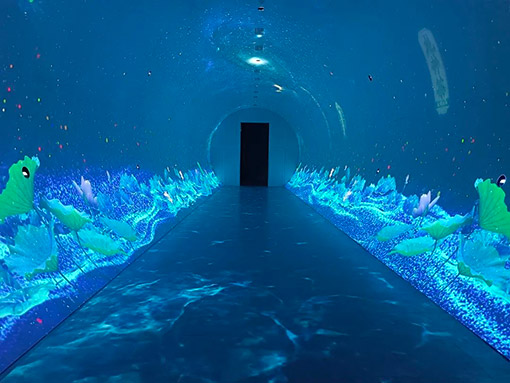 為增加觀眾觀展的多維感官體驗,“數(shù)字隧道”內還設置了地面投影互動功能,觀眾在隧道走過,雷達實時捕捉人的動作,實現(xiàn)人與影像的交互。腳步所及之處或蕩開層層波紋,或有蓮花悄悄綻放,呈現(xiàn)出各有趣味的靈動畫面。