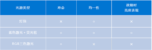綜合比較各類光源,松下采用的激光光源在壽命和均一性方面都表現(xiàn)出優(yōu)勢,且在故障時亮度表現(xiàn)上也有明顯優(yōu)勢。