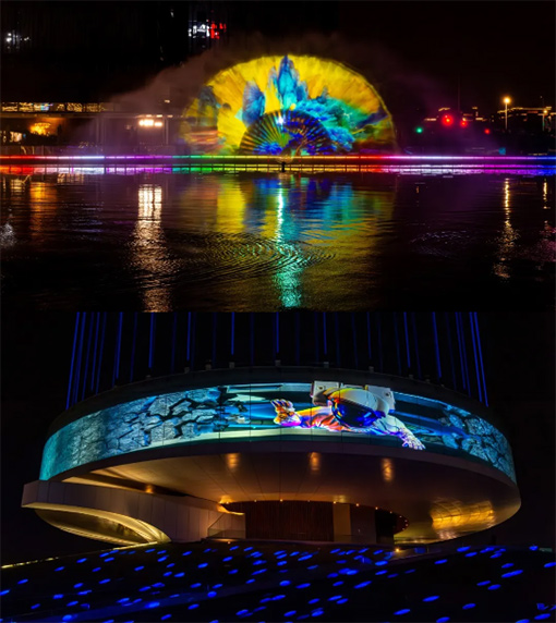 在鄭州如意湖和龍湖上,光影與水共同流動出城市的無限活力,十二道水幕騰空而起,二七塔、大玉米、中原福塔,那些關于鄭州的印記映在朦朧的水幕上,環形建筑上,投影精細勾勒,奉上影像美學與城市文化的交響曲,人們乘運船攬勝,遠眺近觀皆是美景。
