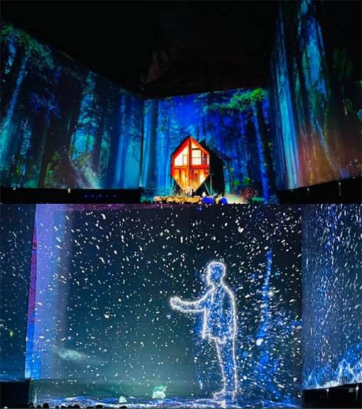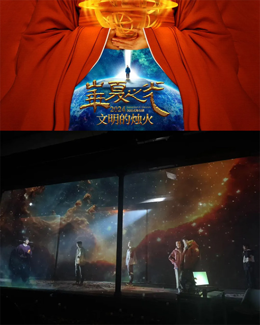 蒼穹廣袤,暗夜無垠,從古至今人們從未停止仰望星空。在中國科技館的多媒體舞臺上,璀璨靜謐的星云浮現紗幕上,虛幻縹緲之感被全息舞臺忠實復刻,紗幕后,古今星空的守望者對談,時空交錯,在多維的舞臺上,千年星光穿過層層塵埃,再次被擦亮。