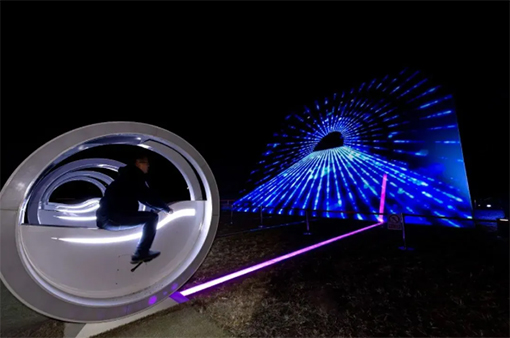 朝陽公園南門內(nèi),《寰宇矩陣》光影項(xiàng)目憑借2臺(tái)32000流明的松下PT-SRZ33KC在高大紗幕上演繹機(jī)械、電子等元素的躍動(dòng)變幻,科技感十足;