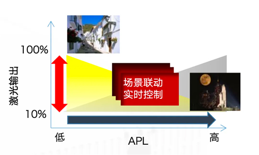 通過調制激光光源輸出,并逐幀跟蹤與場景相關聯的圖像, 可實現出色的黑色再現性和高質感的圖像。(參考下圖)