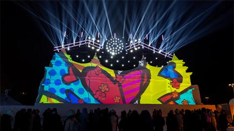 同時,為避免雪的透光性吞噬掉部分投影光,投影設備選擇使用5萬流明紅藍雙色激光投影機,屏前照度達到365Lux。