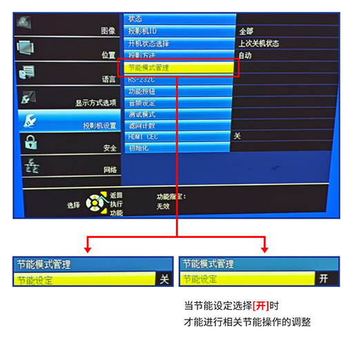 操作步驟:菜單-投影機設置-節(jié)能模式管理-節(jié)能設定-開/關
