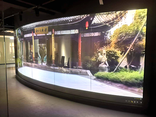 調(diào)光玻璃借助非線性光學(xué)原理,實(shí)現(xiàn)了不同角度同樣均衡的亮度顯示,由其他方向投射來的外環(huán)境光線不會(huì)對(duì)成像產(chǎn)生干擾,即便是在光亮展廳內(nèi)也能大放異彩。超大尺寸的弧形顯示方案,更有利于沉浸式內(nèi)容的展示,給觀眾以包圍的代入感,讓畫面的展現(xiàn)富有張力。