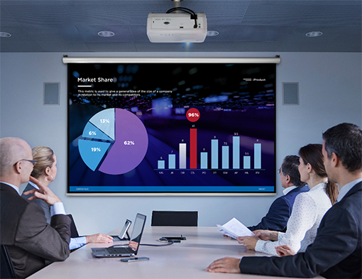 LED投影機在商業領域中也非常成功。它們擁有全面的連接功能,包括屏幕鏡像、可用于數據傳輸和供電的Type-C以及Wi-Fi功能。即時開機節省了會議時間,LED的使用壽命隨著時間的推移更降低了總成本。短焦投射比還使得之前不可能實現的小會議室中也方便使用。和學校一樣,當銷售人員在辦公室外進行演示時,帶有內置電池的便攜款就變得非常方便。