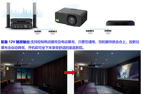 優派LX700-4K Ultra搭配HDMI eARC功能,與音效系統的連接只需要HDMI線,即可無損傳送高品質的數字音頻信號,譬如杜比環繞 7.1;配備的12V觸發輸出,支持控制電動窗簾及電動幕布,只要通電,窗簾就會合上,投影儀幕布會自動降低,開機即可坐下來享受舒適的家庭影院。