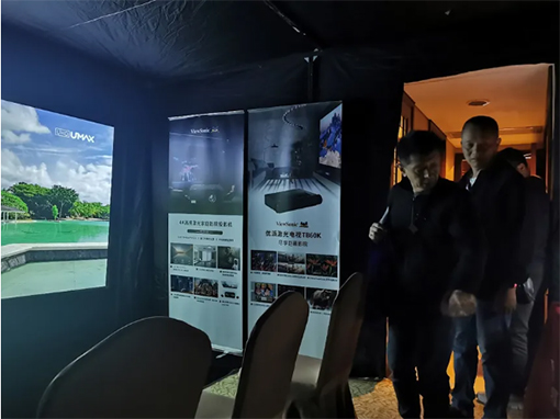 現(xiàn)場所演示的4K激光家用機PZ2318,采用第三代激光光源,0.65”DLP大芯片,1.4-2.24投射比,1.6X大變焦鏡頭,高亮高對比度效果及4K
