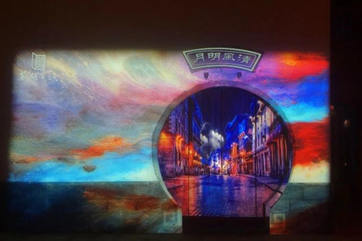 最后走到“月亮門”,1臺(tái)WITIW(威迪泰)MAX-WU120投影炫彩畫面與圓形門廊相互映襯,人們行走期間仿佛步入畫境,激發(fā)夜景之美。